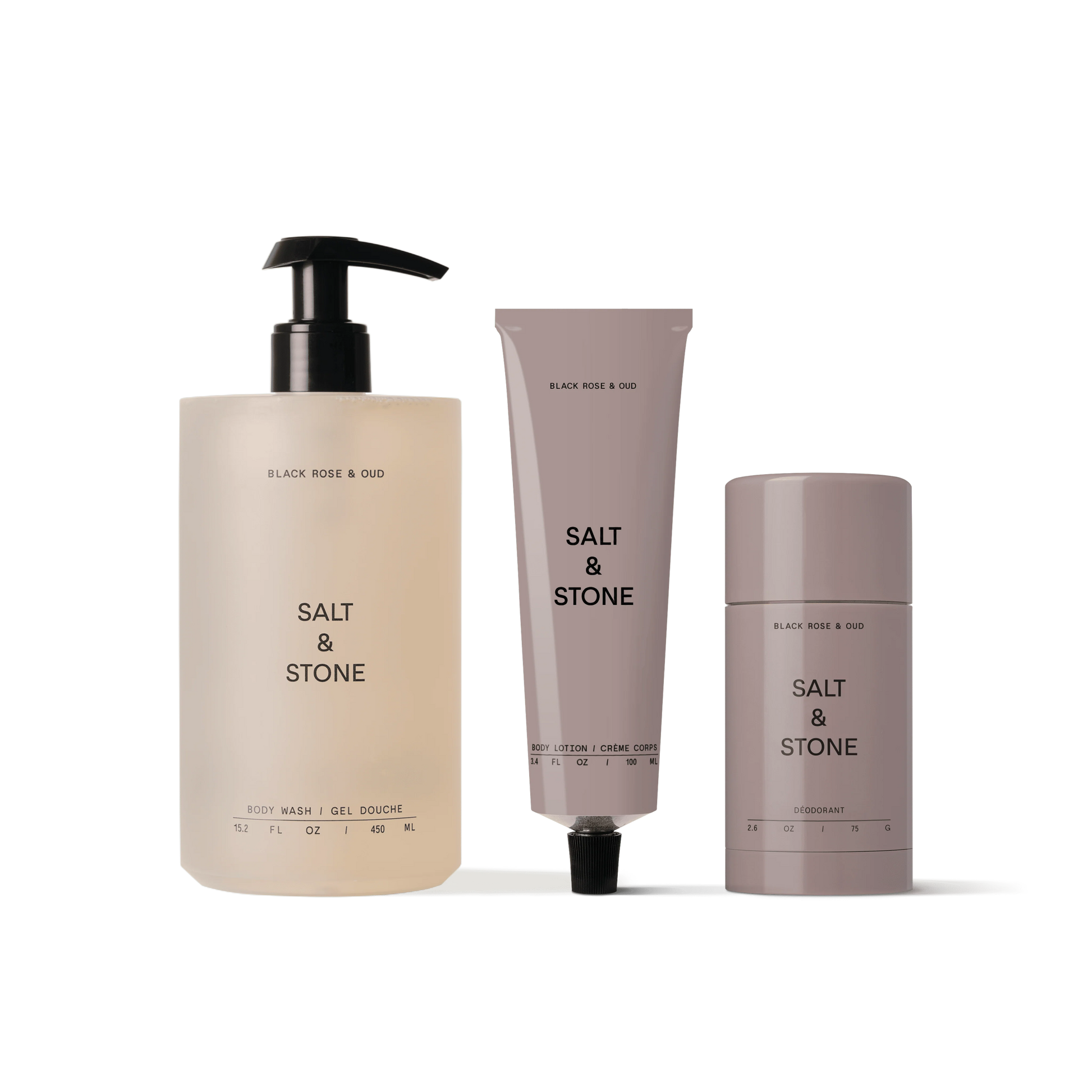A trio of dark, floral Black Rose essentials. Cleanse with body wash, protect with deodorant, and hydrate with body lotion.